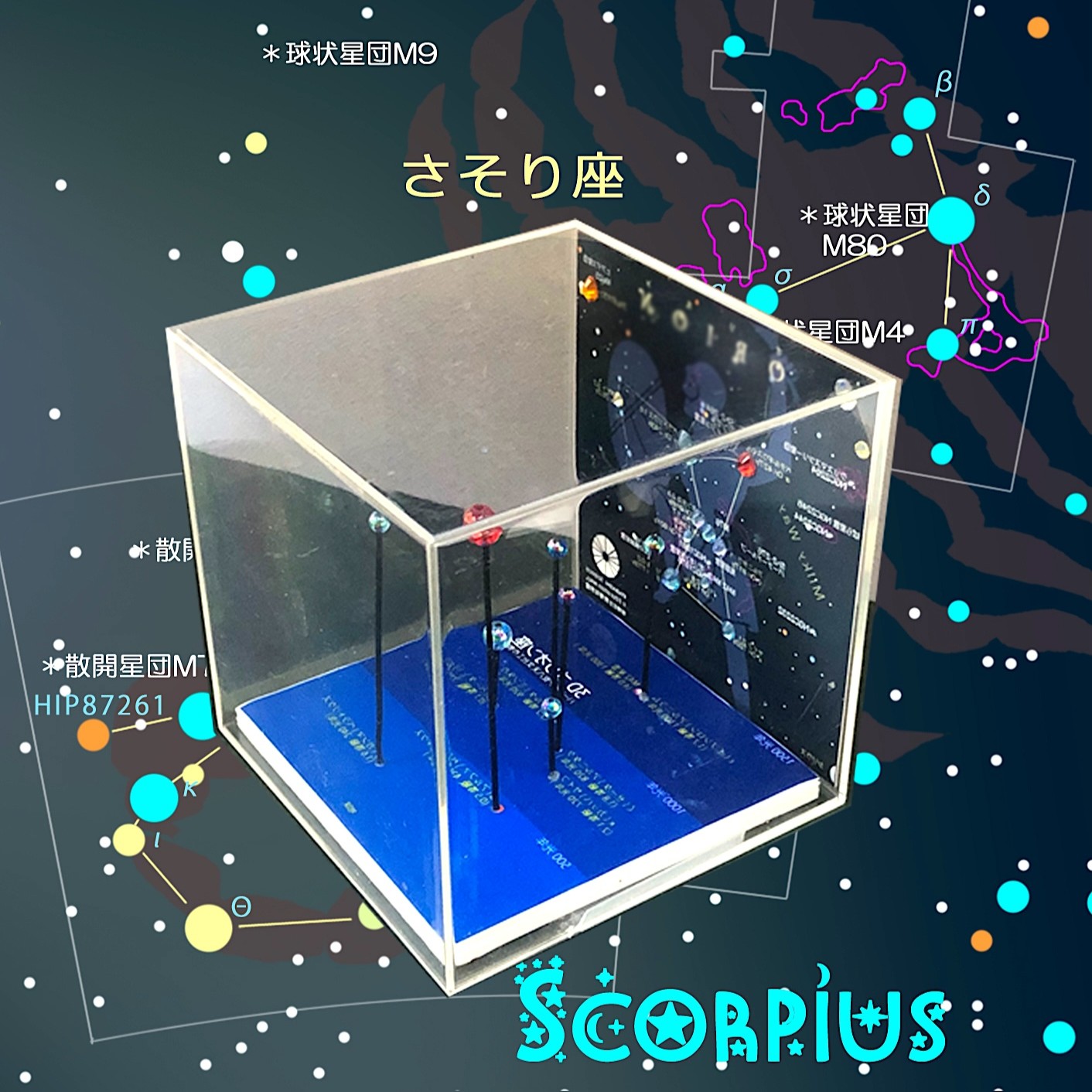 透明キューブケースに入ったさそり座の星々、一見バラバラな星々も正面から見るとあのさそりの形に見えます。等級や色も再現した恒星空間が手のひらに。講話と工作を組み合わせた科学教室です。
